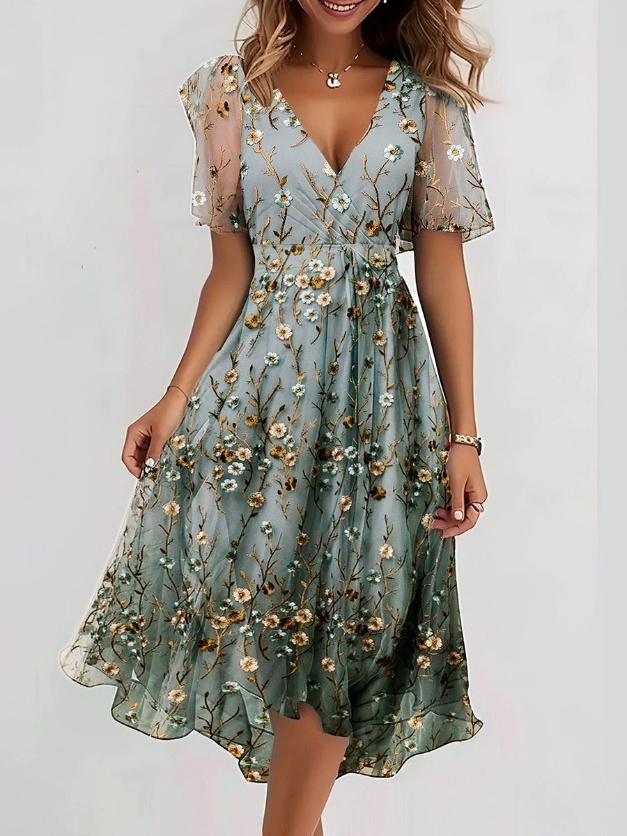 The dress boasts a flattering deep V-neckline, with soft, sheer short flutter sleeves that add a light, airy feel. Ideal for garden parties, brunch dates, or any sunlit special occasion.